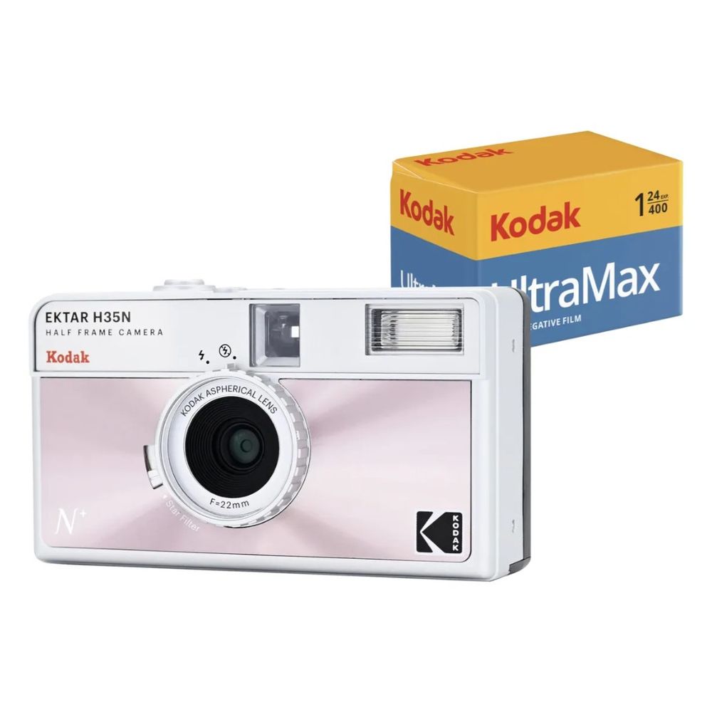 Oferecida aqui em rosa brilhante, a câmera de filme de meio quadro Kodak Ektar H35N é ideal para fotógrafos que buscam reduzir o uso de filme e custos relacionados. Ela possui um flash integrado e um corpo pequeno e leve. A câmera possui uma lente grande angular de foco fixo de 22 mm, perfeita para capturar a maioria das cenas e também possui um flash integrado para fotos noturnas. Compatível com filme negativo colorido de 35 mm ou preto e branco, esta câmera permite capturar instantâneos rápidos ou cenas monocromáticas melancólicas.